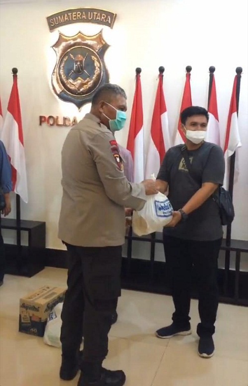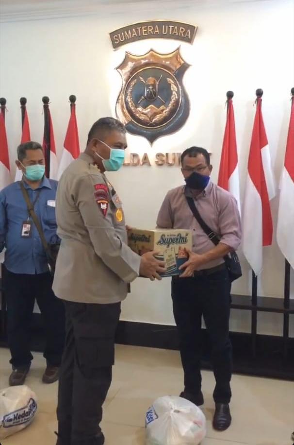 Dalam penyerahan Sembako secara simbolis dengan perwakilan dari para Jurnalis (Wartawan) berunit di Polda Sumut oleh Jurnalis Abanghanda Josmarlin Tambunan Sembako berupa Beras, Gula, Minyak goreng, Mie instan.