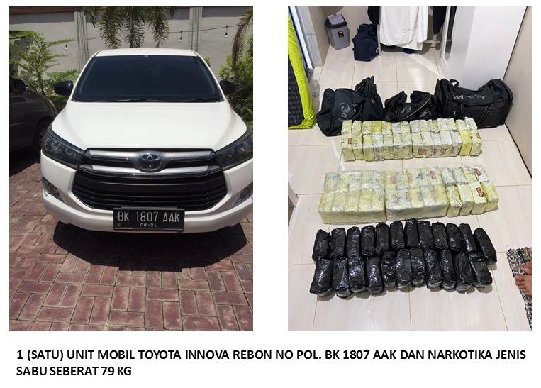 Dari kedua tersangka ini, disita barang bukti berupa 79 bungkus kemasan teh cina berisikan narkotika jenis sabu seberat 79 Kg, 1 unit mobil Toyota Innova Reborn BK 1807 AAK dan 1 unit Toyota Avanza putih BL 1067 F.