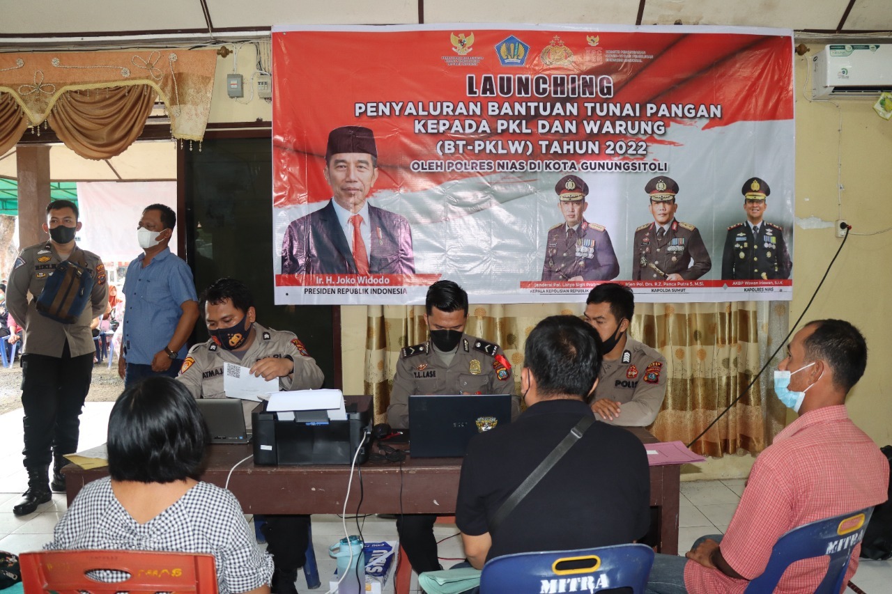 GUNUNGSITOLI | TRANSPUBLIK.co.id – Polres Nias Launching Penyaluran Bantuan Tunai Pangan dengan sasaran kepada Pedagang Kaki Lima dan Warung (BTP-PKLW) untuk Warga Gunungsitoli bertempat di Aula Kamtibmas Polres Nias Jalan Melati Kelurahan Ilir Kota Gunungsitoli, Kamis (28/4/2022).