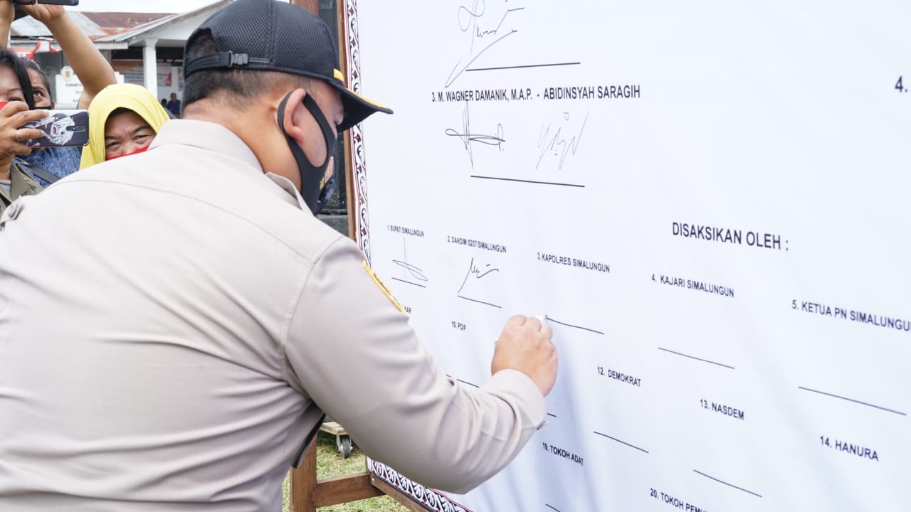 Kapolres Simalungun AKBP Agus Waluyo, SIK dalam kata sambutannya menghimbau kepada masyarakat agar tetap mentaati protokol kesehatan dalam menjalankan tahapan Pemilihan Bupati dan Wakil Bupati Simalungun pada tanggal 9 Desember 2020 mendatang.