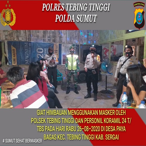 Kapolres Tebing Tinggi AKBP James P Hutagaol, S.IK melalui Kapolsek Tebing Tinggi Iptu Dhoraria S Simanjutak, SH. MH mengatakan, “adapun sasaran memberi himbauan kepada masyarakat yaitu di tempat keramaian (Cafe) di Desa Paya Bagas, Kecamatan Tebing Tinggi, Kab. Serdang Bedagai, yaitu untuk mencegah dan memutus mata rantai penyebaran virus Corona (covid-19) kita harus Memakai Masker, Mencuci Tangan dengan sabun pada air yang mengalir, Menjaga Jarak dan mari kita ikuti Protokol Kesehatan dan kebijakan Pemerintah untuk memutus matarantai Covid – 19,” ucap Kapolsek.