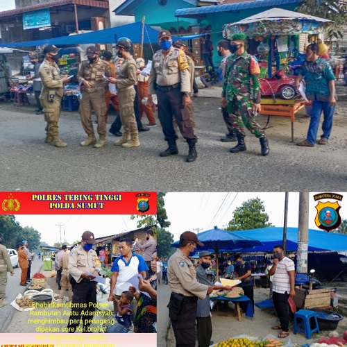 TEBING TINGGI | TRANSPUBLIK.co.id – Polres Tebing Tinggi melalui Bhabinkamtibmas Polsek Rambutan bersama dengan anggota Koramil ,dan Lurah Berohol, Kec Rambutan, Kota Tebing Tinggi melaksanakan sosialisasi pendipsilinan penerapan adaptasi kebiasaan baru dengan mendisiplinkan para pedagang dan masyarakat yang berbelanja di Pekan Sore Kel. Brohol, Kec Rambutan, Kota Tebing Tinggi, untuk selalu menggunakan masker, Sabtu (29/8/2020) sekira pukul 17.00 WIB.