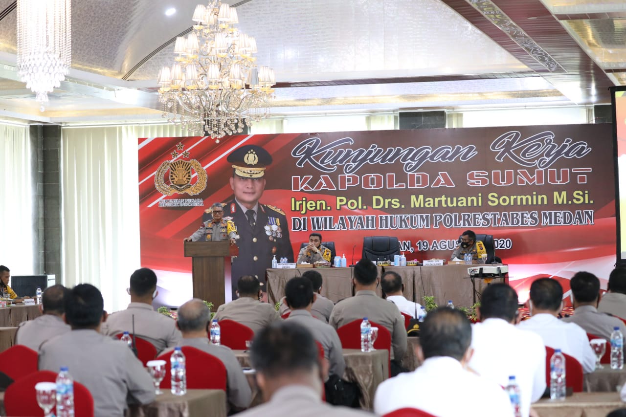 DELI TUA | TRANSPUBLIK.co.id – Setelah melaksanakan rangkaian kegiatan di Kampung Paten Peduli Sehat Deli Tua, Kapolda Sumut melanjutkan dengan memberikan arahan kepada personil Polrestabes Medan bertempat di Hotel Pancur Gading Deli Tua, Rabu (19/8/2020).