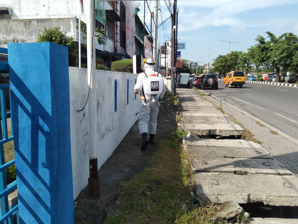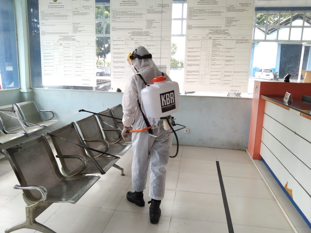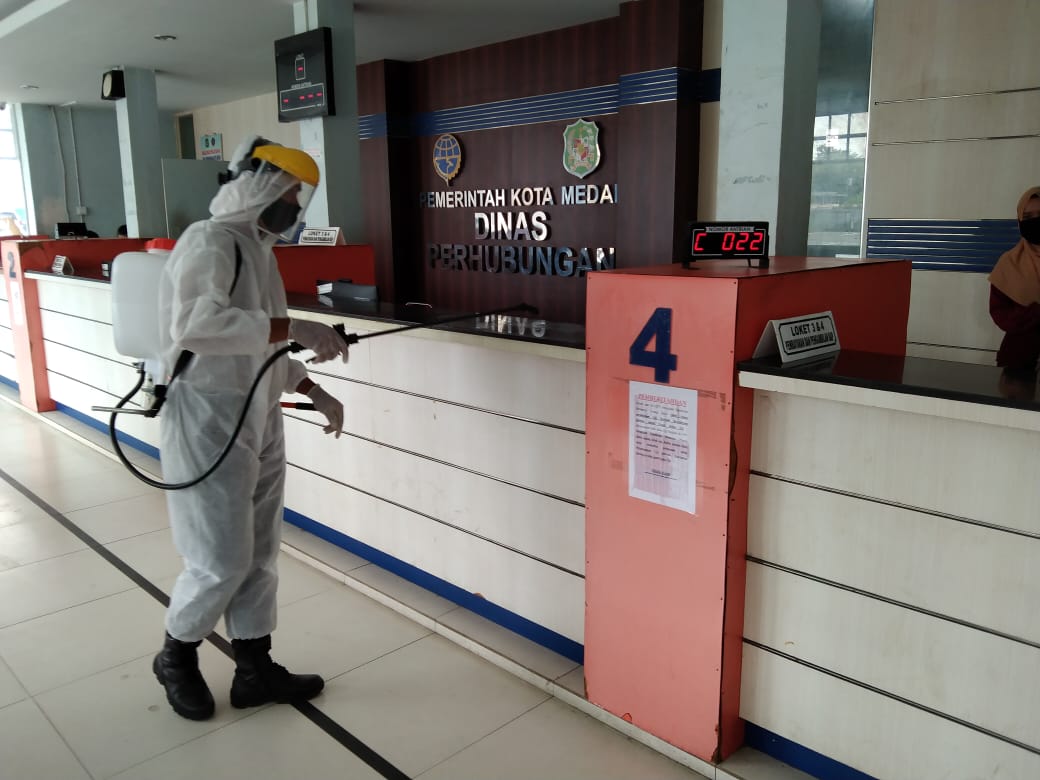 Dalam kegiatan penyemprotan cairan Disinfektan mulai bertempat dari lokasi areal kawasan Terminal Pinang Baris meliputi gedung pemeriksaan kendaraan KIR serta loket administrasi di Jln Pinang Baris Kota Medan.