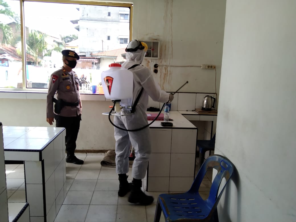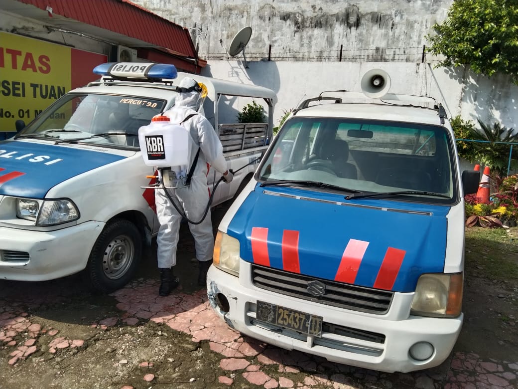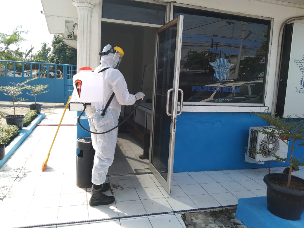 Dengan serta dilanjuti melakukan kegiatan penyemprotan cairan Disinfektan baik dari tiap-tiap ruangan serta areal lingkungan Polantas Jln Wiliam Iskandar Kota Medan.