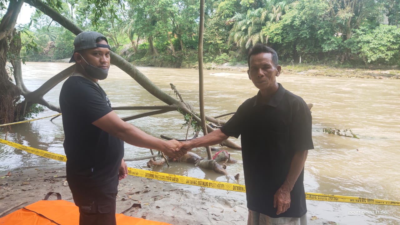 SIMALUNGUN | TRANSPUBLIK.co.id -Personil Polsek Bosar Maligas mengevakuasi jasad Dianson Sinaga (23) warga Huta Sipangan Bolon 1 Nagori Raja Maligas 1 Kecamatan Huta Bayu Raja Kabupaten Simalungun di Sungai Bah Tongguran Nagori Sei Mangke Kec. Bosar Maligas Kabupaten Simalungun, Selasa (11/5/2021) pagi sekira pukul 08.30 WIB.
