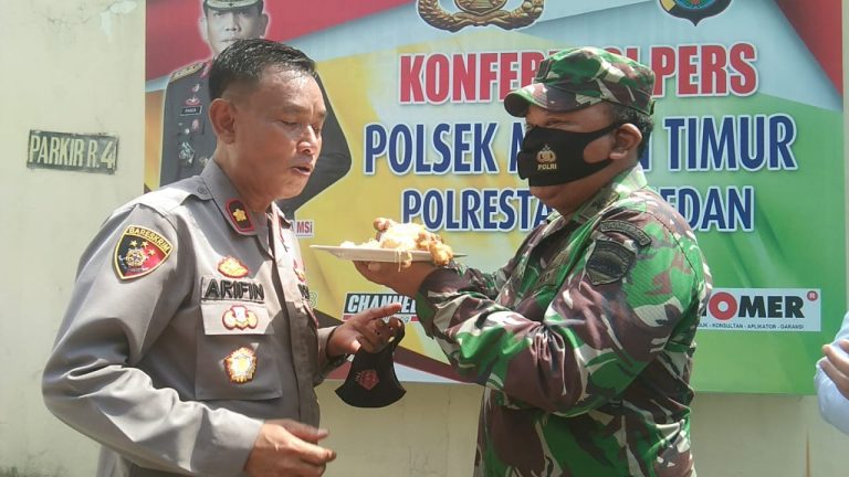 Transpublik.co.id : MedanTimur-Personil Polsek Medan Timur mendapatkan suprise/dikejutkan kedatangan personil Koramil 0201 MT dan Kecamatan Medan Timur yang membawa Nasi Tumpeng saat Hari Ulang Tahun (HUT) Bhayangkari ke 75, Kamis (01/07/2021).