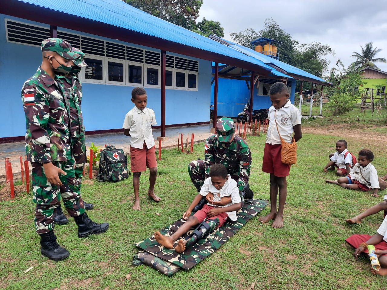 MERAUKE | TRANSPUBLIK.co.idBerikan motivasi dan suasana baru, Satgas Pamtas Yonif 125/Simbisa ajarkan materi pelayanan kesehatan (pertolongan pertama) kepada Siswa-siswi di Sekolah Dasar (SD) YPK Toray Distrik Sota, Kabupaten Merauke, Provinsi Papua.