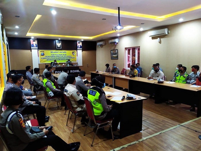 ROKAN HILIR | TRANSPUBLIK.co.id – Tim Pusat Penelitian dan Pengembangan (Puslitbang) Polri, melakukan kegiatan penelitian tentang Tata Kelola Sumber Daya Polri (SDP) dalam implementasi teknologi informasi dan komunikasi terpadu di Aula Patriatama Polres Rokan Hilir, Selasa (20/10/2020).