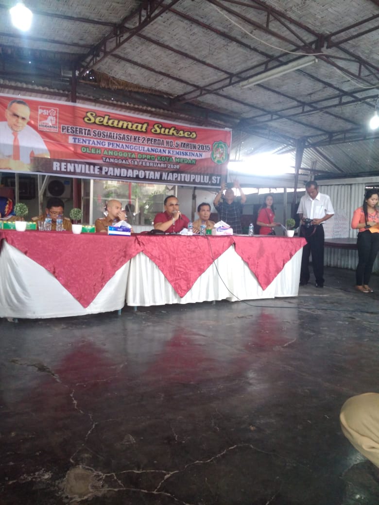 Renville Pandapotan Napitupulu ST dalam kata sambutannya untuk sosialisasi yang kedua ini masih banyak masyarakat yang belum hadir sementara inilah wadah masyarakat untuk bertemu dengan wakilnya di pemerintahan dan dinas terkait, dimana sosialisasi kedua ini membahas Perda no 5 tahun 2015 yang mengupas tentang penanggulangan kemiskinan.