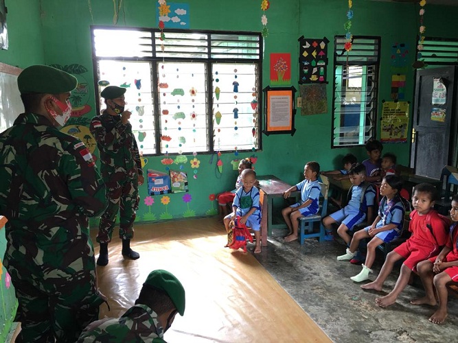 Dansatgas mengatakan di sela-sela melaksanakan pengamanan perbatasan negara prajurit satgas juga menyempatkan diri membantu proses belajar mengajar di TK Cenderawasih Arsotami.