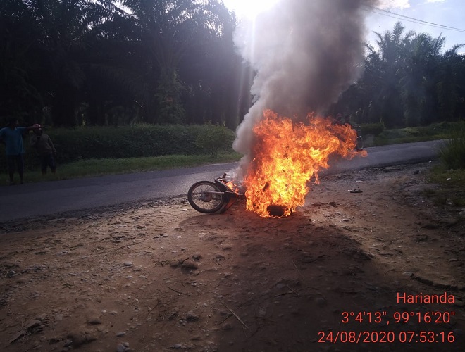 SIMALUNGUN | TRANSPUBLIK.co.id – Satu unit sepeda motor honda astrea grand ludes terbakar dilalap sijago merah dijalan besar Pematang Bandar, Kelurahan Kerasaan I, Kecamatan Pematang Bandar, Kabupaten Simalungun, Senin (24/8/2020) sekira pukul 07.55 WIB.