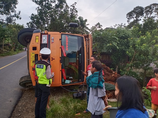 “Kejadiannya sewaktu Mobil Mitsubishi Truk Tronton B 9349 BYZ bermuatan sawit yang dikemudikan oleh Tompul Panggabean datang dari arah Batangtoru menuju arah Padangsidimpuan, setibanya di TKP dari arah berlawanan datang satu unit Mobil Truk dikarenakan badan jalan yang kecil sehingga Mobil Mitsubishi Truk Tronton B 9349 BYZ menjatuhkan ban ke beram jalan sebelah kiri, tiba-tiba beram jalan tersebut tidak sanggup menahan beban mobil sehingga mobil terbalik ke halaman rumah milik warga yang berada di sebelah kiri jalan arah Padangsidimpuan,” ujar Kasat Lantas Polres Tapsel.