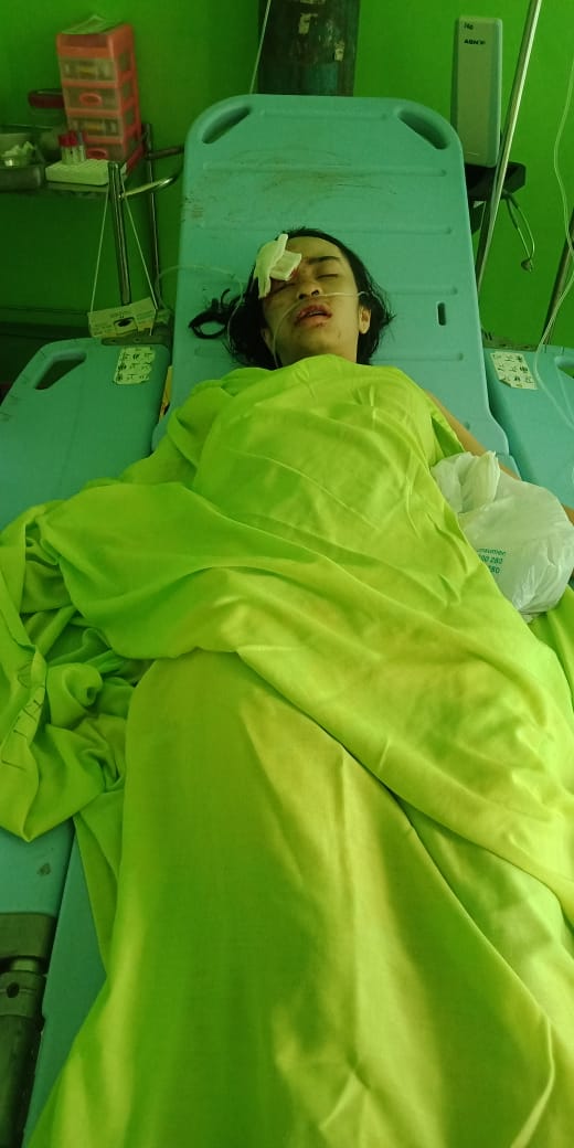 Dia mengalami luka robek pada bagian kepala sebelah kanan, luka memar pada bibir atas, luka lecet pada kaki sebelah kanan, berobat di RSUD Sultan Sulaiman.