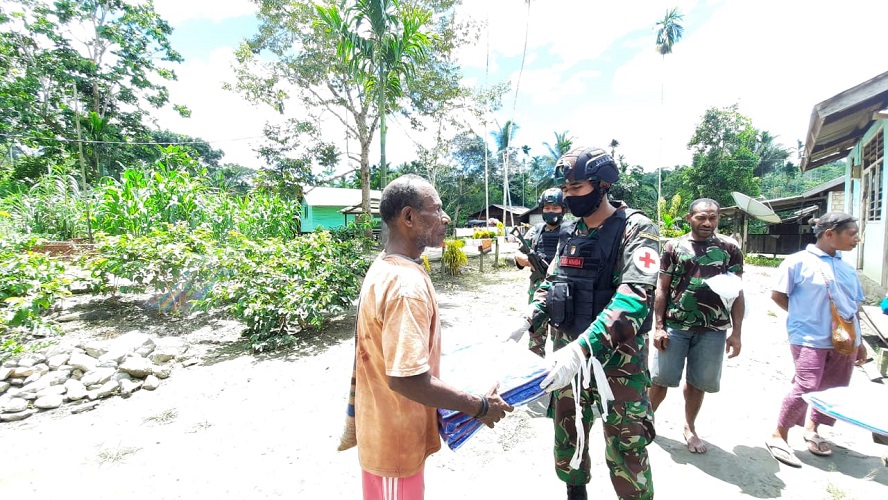 KEEROM | TRANSPUBLIK.co.id – Bekerja sama dengan petugas puskesmas waris dalam upaya pencegahan penyakit malaria, Satgas Pamtas RI-PNG Yonif Raider 100/PS membagikan kelambu anti nyamuk kepada warga Kampung Banda, Kab.Keerom, Prov. Papua pada Selasa (27/10/2020).