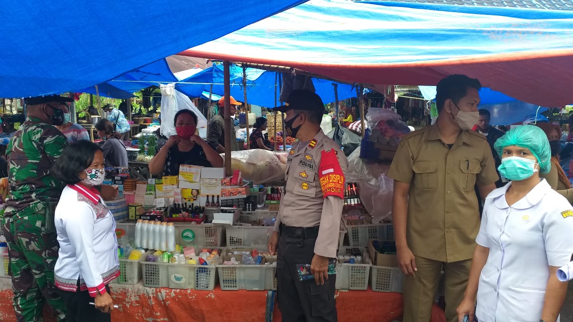 SIMALUNGUN | TRANSPUBLIK.co.id – Kapolsek Pematang Raya Iptu L. Silalahi bersama Personil Koramil 14 Raya Serda Darlizon Purba, pegawai puskesmas Pematang Raya Melis Purba, Lurah Merek Raya Pasma br Damanik, pegawai Kominfo Pemkab Simalungun Akbar Siregar, melaksanakan kegiatan pendisiplinan penggunaan masker serta penerapan protokol kesehatan dalam kegiatan sehari-hari di Pekan Merek Raya, Kec. Raya, Kab. Simalungun, Selasa (1/9/2020).