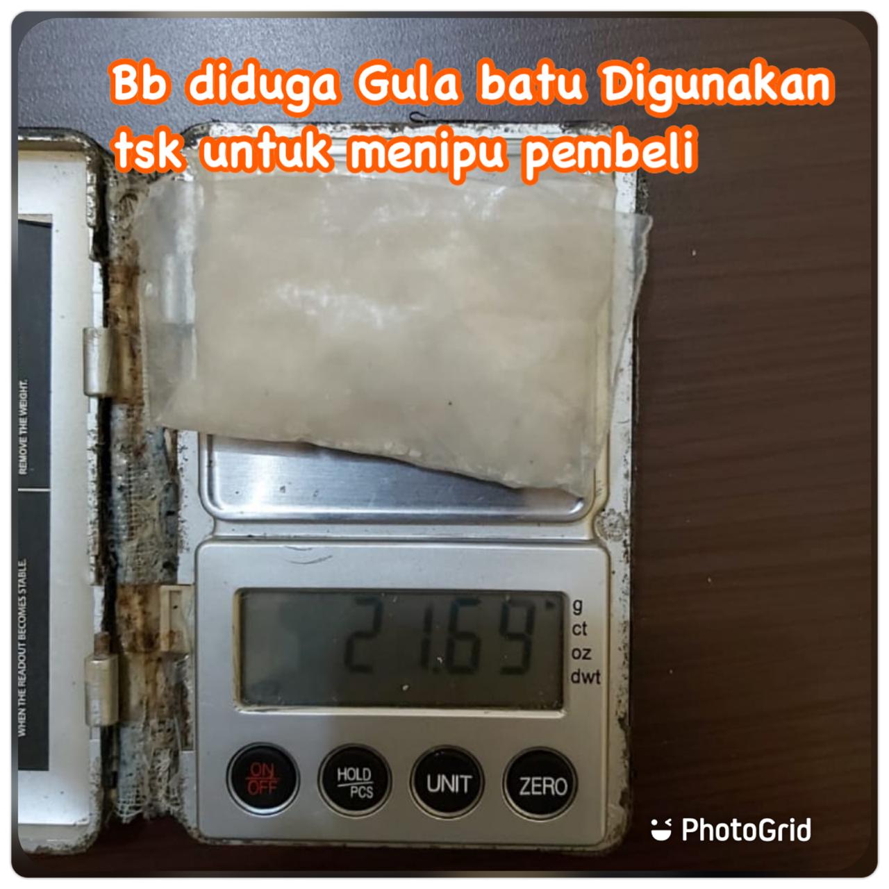 Selain itu ditemukan satu plastik berisi butiran kristal putih yang menurut pengakuan pelaku adalah bukan narkotika jenis sabu melainkan gula batu yang digunakan pelaku untuk menipu para pembeli guna meraup untung lebih, dengan berat sekitar 21,69 Gram 2 buah timbangan digital, satu plastik besar yang didalamnya terdapat plastik plastik berbagai ukuran.