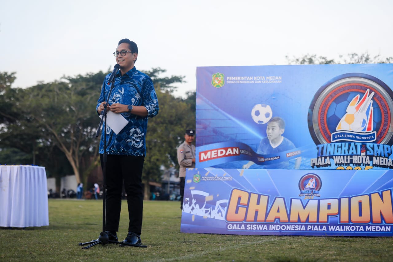 MEDAN – Turnamen Gala Siswa Indonesia (GSI) tahun 2025 antar Sekolah Menengah Pertama (SMP) se- Kota Medan yang berlangsung di Lapangan Sepakbola Cadika, Medan Johor, resmi ditutup Wali Kota Medan Rico Tri Putra Bayu Waas, Sabtu (19/7/2025). Kegiatan yang berlangsung selama 5 hari ini diikuti 21 tim sepakbola pelajar dari 21 Kecamatan yang ada di Kota Medan.