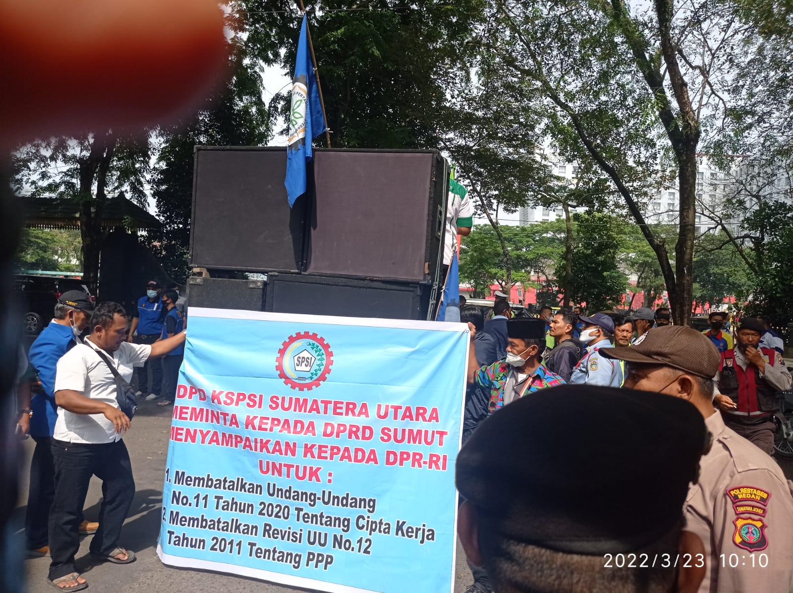 Dalam aksinya, massa membawa pengeras suara dan membentangkan spanduk mengenai tuntutan mereka. Massa mendapat pengawalan dari aparat kepolisian. (TP/ES)