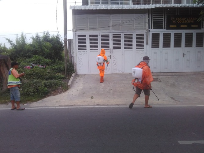 Penyemprotan dilakukan pada pukul 09.00 WIB, langsung dikoordinir oleh Kepling Lingkungan I A, bapak Usman Hutahuruk bersama beberapa orang pekerja Kecamatan (alias buser), Kamis (2/4/2020).
