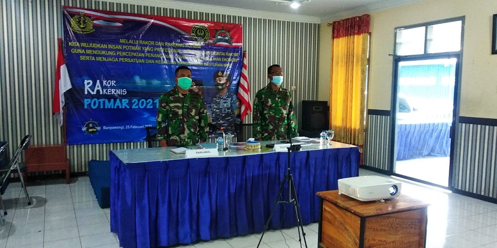 BANYUWANGI | TRANSPUBLIK.co.id – Dalam rangka Rakor dan Rakornis Potmar Tahun 2021 yang dibuka langsung oleh Asisten Potensi Maritim (Aspotmar) KASAL, Aspotmar KASAL Mayor Jenderal TNI (Mar) Dwi Purwanto Widodo, via Video Conferensi (Vidcon) Komandan Pangkalan TNI Angkatan Laut (Danlanal) Banyuwangi, Lantamal V, Koarmada II Letkol Laut (P) Joko Setiyono, S.E., M.Tr.Hanla beserta perwira staf potensi maritim (Paspotmar) Lettu Laut (KH) Riyanto, S.H., mengikuti dengan seksama di Wisma Bahari Mako Lanal Banyuwangi, Jl. Raya Situbondo nomor 54, Desa Ketapang, Kecamatan Kalipuro, Kamis (25/2/2021).